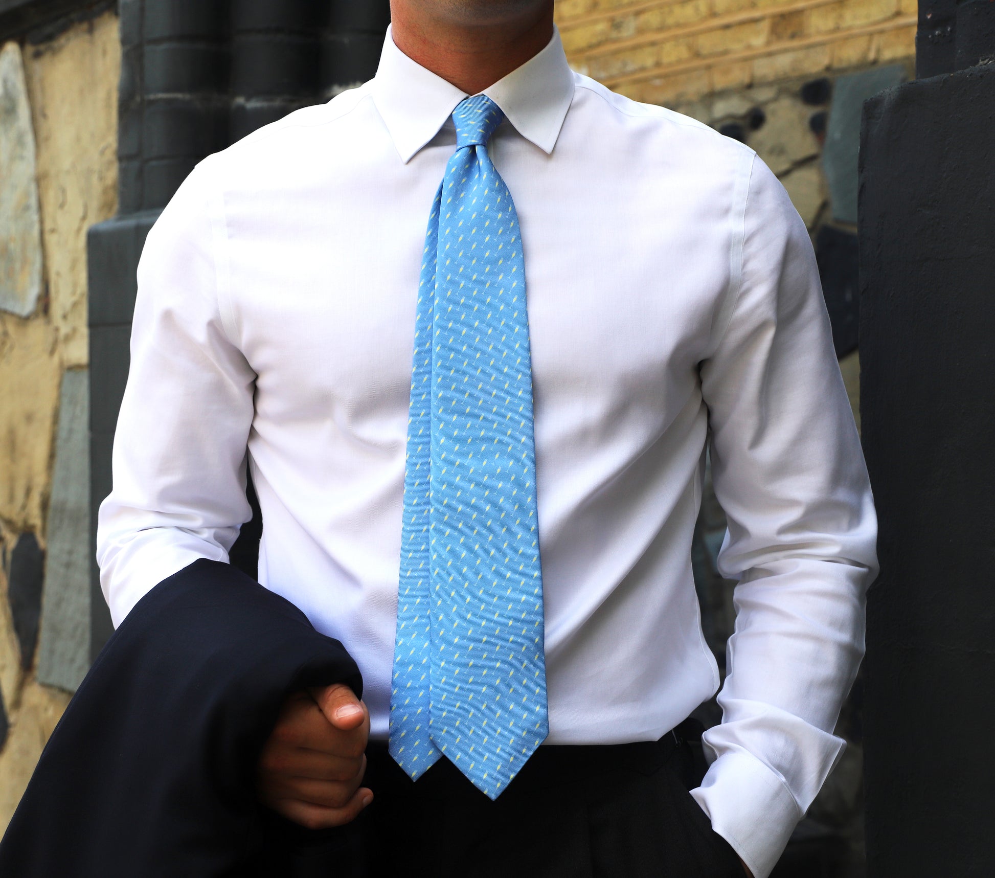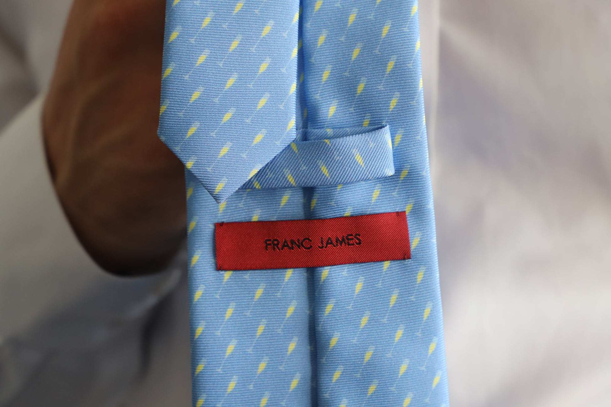 A repeat pattern of classic champagne flutes on soft ColumbiaBlue silk. Printed and hand-stitched in England from luxurious 36 oz silk, this tie is strictly limited to just 100 pieces worldwide.