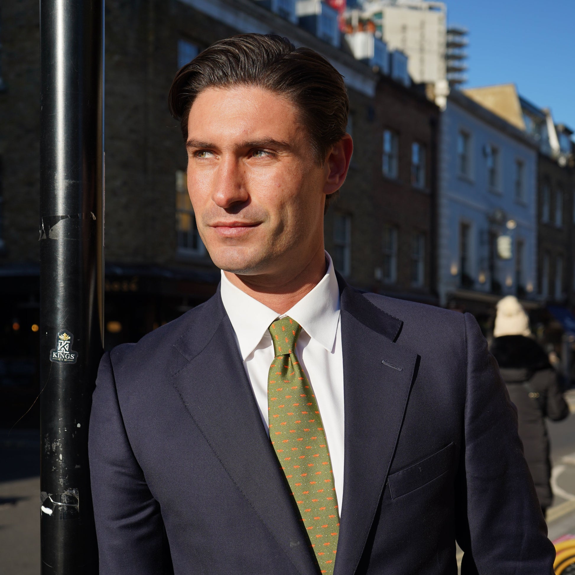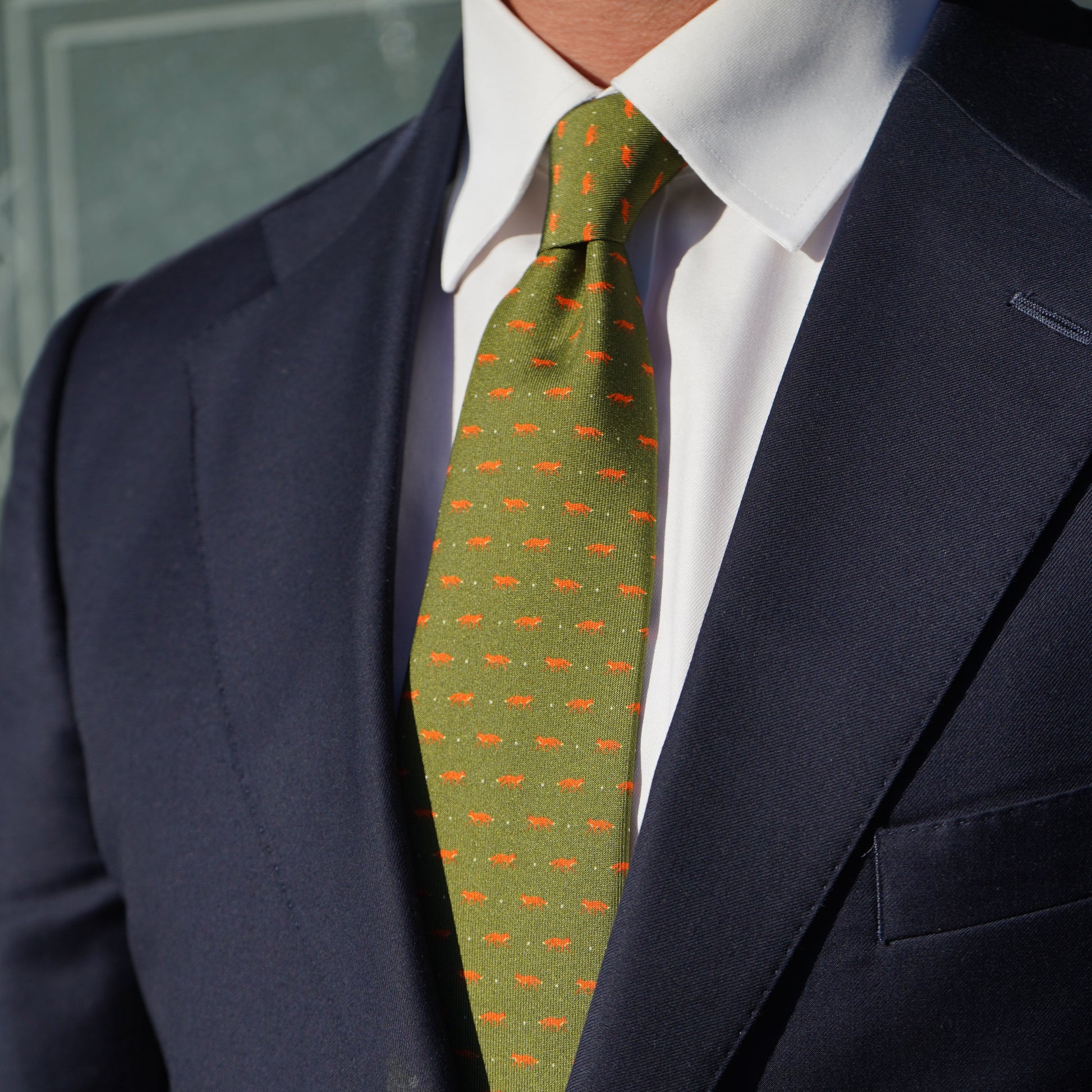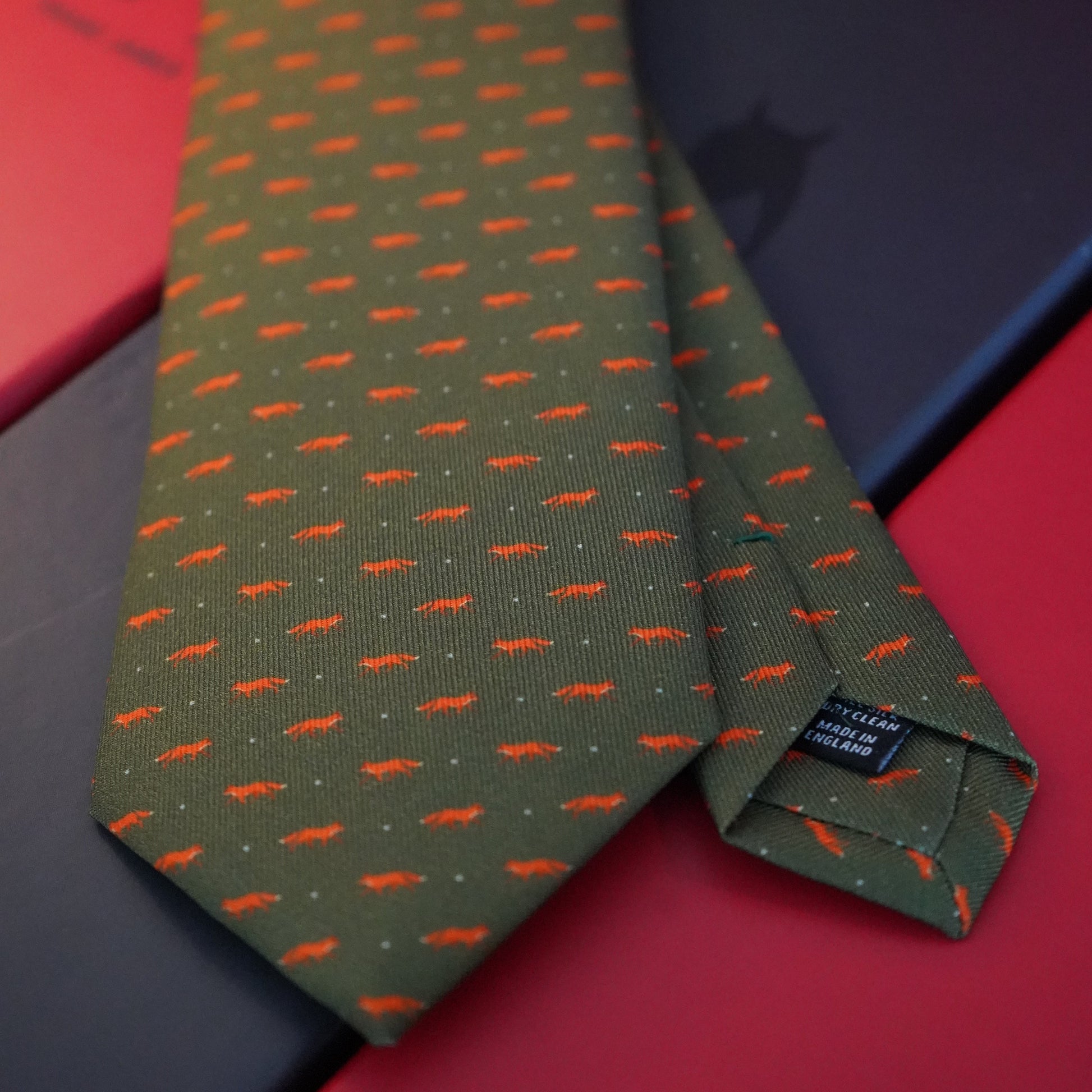 A repeat fox motif on a classic country green silk. Printed and hand-stitched in England from luxurious 36oz silk, this tie is strictly limited to just 100 pieces worldwide.