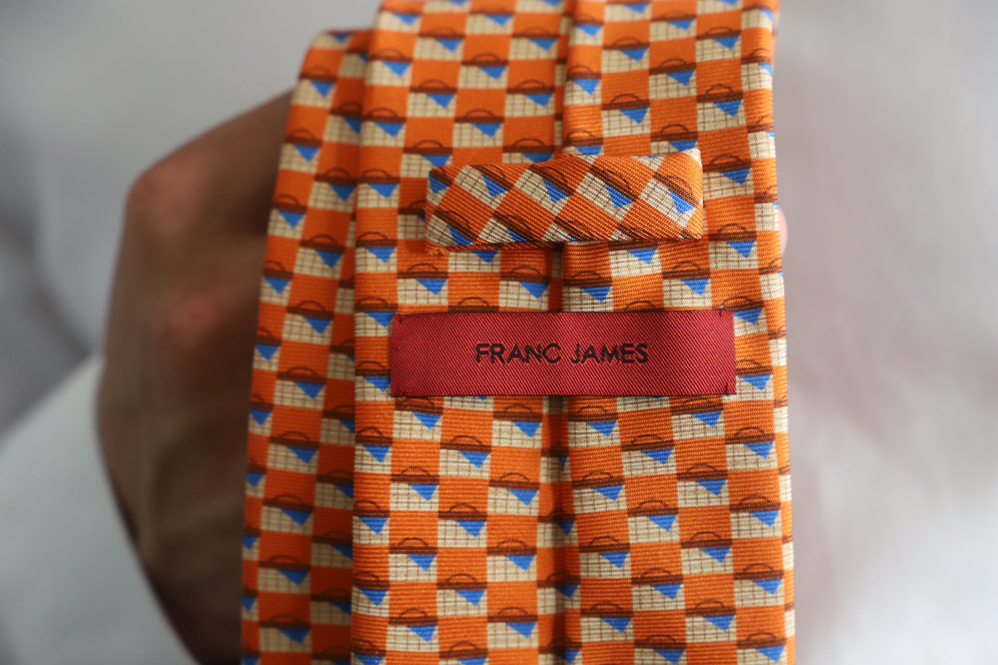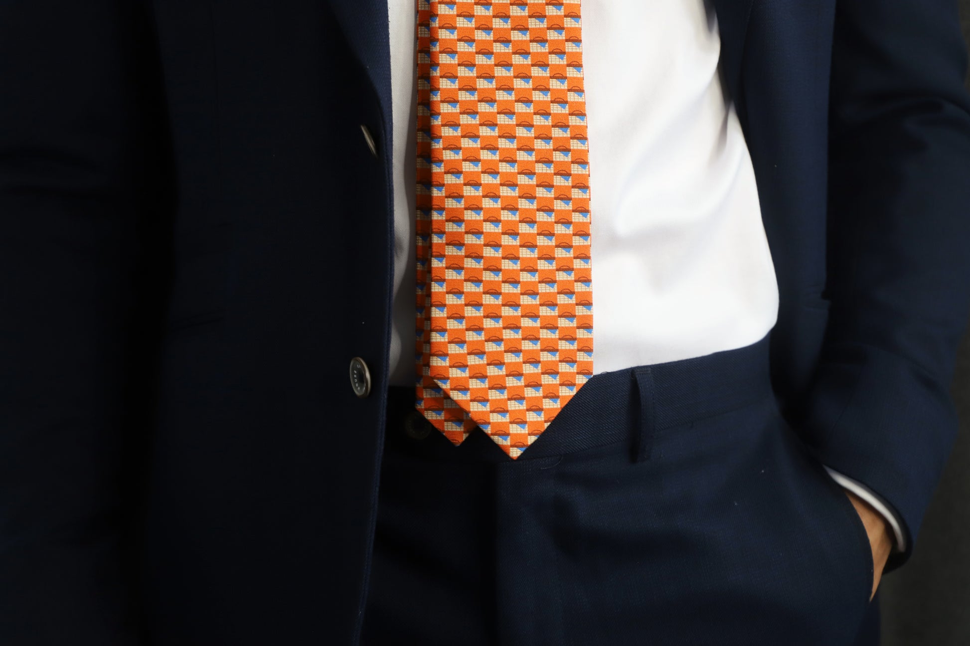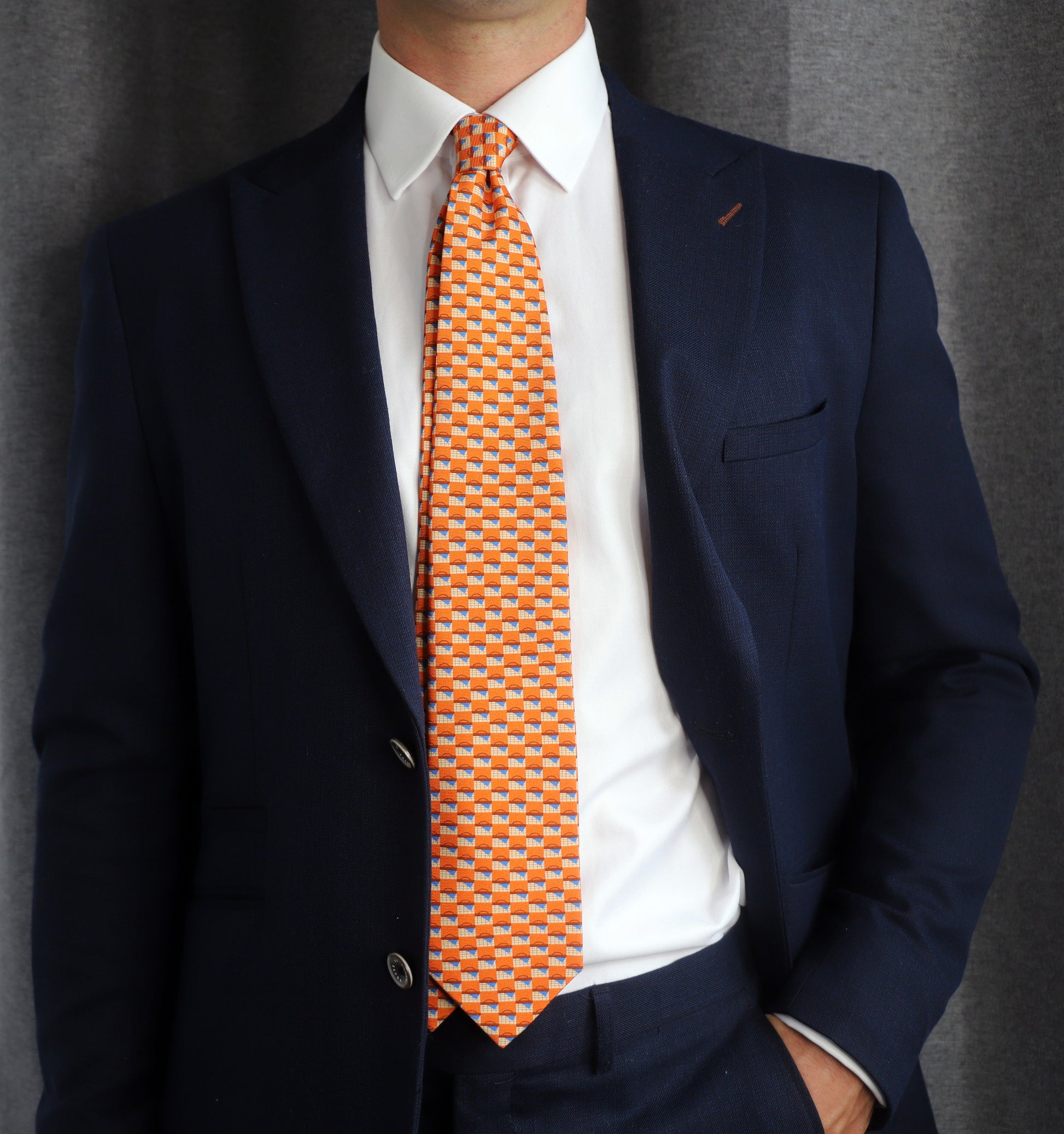 A repeat picnic basket motif on warm Flame Amber silk. Printed and hand-stitched in England from luxurious 36 oz silk, this tie is strictly limited to just 100 pieces worldwide.